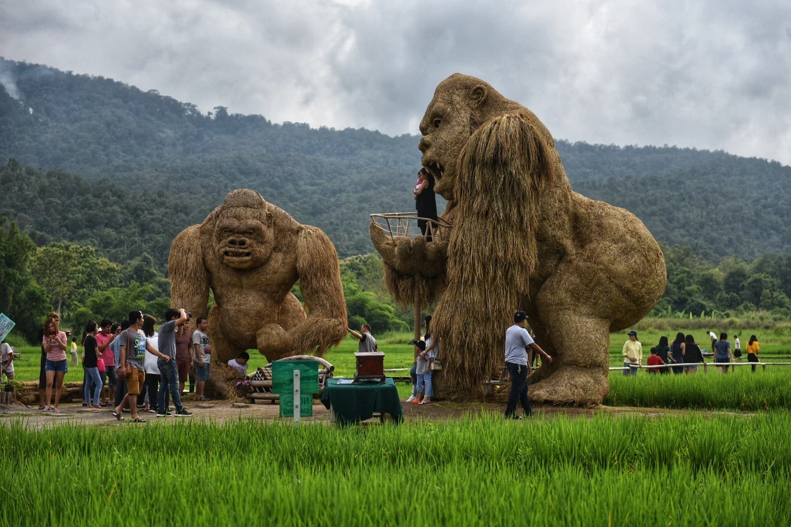 ชมบรรยากาศทุ่งนากว้างใกล้เมืองเชียงใหม่ ถ่ายภาพกับ หุ่นฟางคิงคองยักษ์ ที่อ่างเก็บน้ำห้วยตึงเฒ่า สถานที่พักผ่อนของชาวเชียงใหม่ ที่สร้างความตื่นเต้นและดึงดูดให้นักท่องเที่ยวเดินทางมาถ่ายภาพหุ่นคิงคองและชมบรรยากาศทุ่งนาสีเขียวที่มีภูเขาเป็นฉากหลังอย่างไม่ขาดสาย มีสะพานไม้ไผ่ทอดยาวกลางนา นอกจากนี้ยังมีกระท่อมกลางนาซึ่งเปิดให้บริการเป็นที่พักอีกด้วย