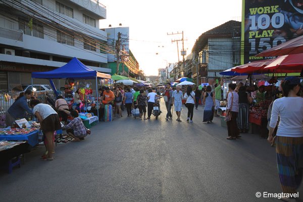 ถนนคนเดินวันเสาร์ ที่มากมายไปด้วยของกินของใช้ ของฝาก ของที่ระลึก โดยของที่นำมาขายส่วนมากจะเป็นของท้องถิ่นในจังหวัดภาคเหนือ ราคาขายไม่แพง ถูกกว่าที่ไนท์บาร์ซ่าเชียงใหม่ ถนนคนเดินวัวลายจะเริ่มเปิดตอนประมาณ 17.00 น และจะปิดประมาณ 22.00 น. ช่วงเวลาที่คนเยอะที่สุดจะเป็นช่วง 19.00 – 20.00 น.